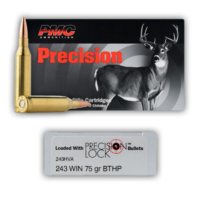 PMC Precision ammo is designed with all the features hunters would want. This example, in popular .243 Winchester, is loaded with a 75 Grain boat tail hollowpoint bullet which it launches at 3400 fps. It's a super choice for hunting a wide variety of game animals and invasive species.