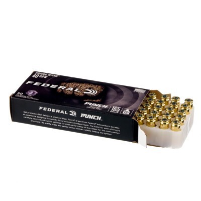 This 165 grain load throws its jacketed hollow point bullet at a velocity of 1,130 fps – just a touch faster than the speed of sound, which translates to flat close-range trajectory and 400+ ft lbs striking energy within around 47 yards (Federal records .40 S&W muzzle velocity with a 4” test barrel).