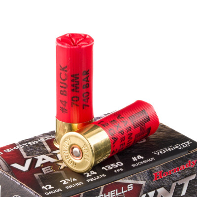 Hornady makes some fine ammo for a variety of uses, including this 12 Gauge Varmint Express round. It comes in a 2-3/4" shell with 24 pellets of #4 buck shot fired at 1350 fps. It's an excellent round for ridding your property of coyotes.