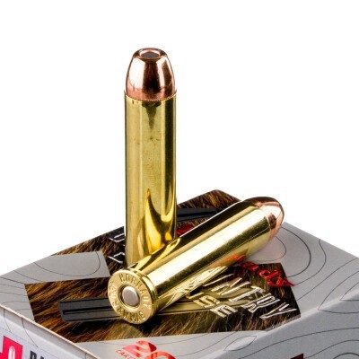 This round’s Dangerous Game Handgun bullet is no pushover. At 300 grains and 1,820 fps muzzle velocity, it can easily deliver over 2,000 ft lbs of force to its target. As if that weren’t bad enough for said target, the DGH’s protected point design enables it to penetrate *extremely* deeply, as well as resist deflection that could have turned it aside from its trajectory toward a bear’s thickly armored vital organs.