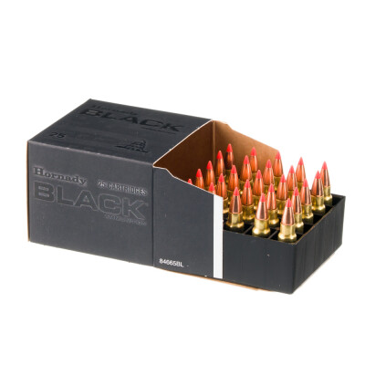 Hornady BLACK ammunition is specifically optimized for maximum performance in America's favorite modern sporting rifles. This load uses Hornady's polymer tipped V-MAX bullet. Hornady's V-MAX bullets are streamlined for ultra flat trajectories and contain a premium polymer tip for rapid expansion and maximum energy transfer. The match grade jacket delivers surgical accuracy while unique construction delivers explosive fragmentation every time. America's gun runs on BLACK!Hornady BLACK Ammunition Specifications and Features: