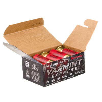 Hornady’s Varmint Express 12 Gauge shell is loaded with two dozen pieces of #4 buckshot (to be sure, that’s *buck*shot: 0.24” in diameter as opposed to 0.14”, and therefore over a dozen times heavier). The #4 is as small as buckshot gets, hence this shell’s high pellet count and accordingly dense spread.