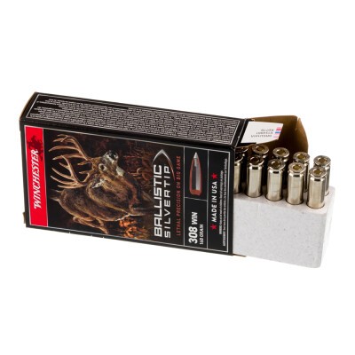 Make sure you choose your ammunition wisely when you plan to stalk big game. This Winchester's Ballistic Silvertip round in .308 Winchester, using a 168 Grain Jacketed Hollow Point with a polymer ballistic tip, and has a muzzle velocity of 2670 fps.Solid based boat tail design, polymer ballistic tip, and contoured jacket delivers excellent long-range accuracy and reduces cross-wind drift. Harder Alloyed Lead Core ensures proper bullet expansion. Proprietary Lubalox (Black Oxide) Coating reduces bore wear. Use for hunting big game with thick or thin skin such as whitetail and mule deer, antelope, black and brown bear, elk, moose, and caribou.
